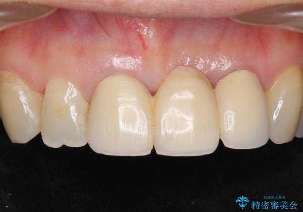 前歯のレジン前装冠(保険内)によるブリッジは、金属で裏打ちされており透明感がなく不自然で、ポンティックも必要以上に長く作られていました。