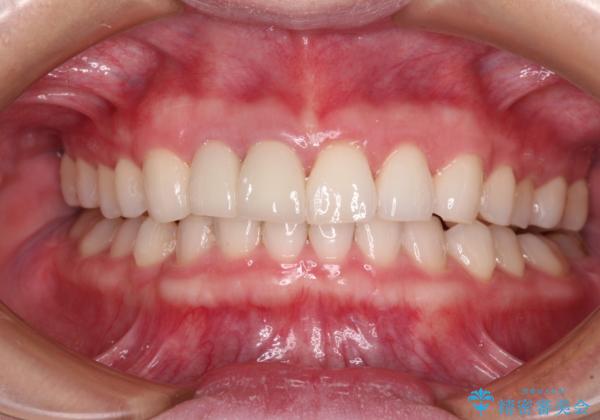 矯正治療中に前歯2本のクラウンは外れてしまい、途中仮歯に替える必要があったので期間は掛かりましたが、歯列も整い、負担のかからない咬み合わせを達成することができました。