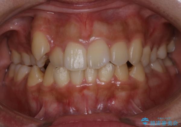 - 前歯の出っ張りが気になるとの事でご相談にいらした方です。左下に残存していた乳歯は抜歯し、全体の歯並びを整えてからインプラントを入れる計画を立てました。