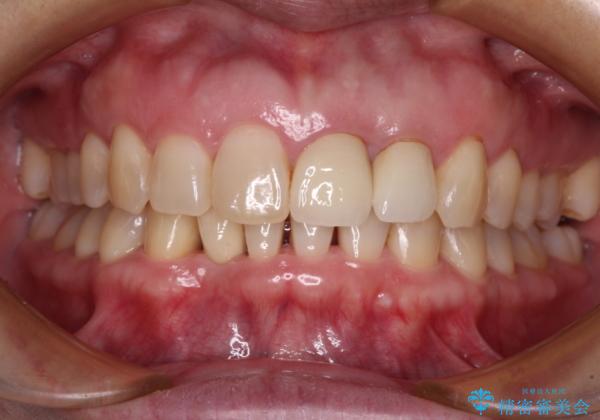 抜歯後にスペースができると恥ずかしいため、抜歯した歯を接着剤で固定した上で矯正治療を行い、その後インプラントやオールセラミッククラウンの装着を行うこととしました。