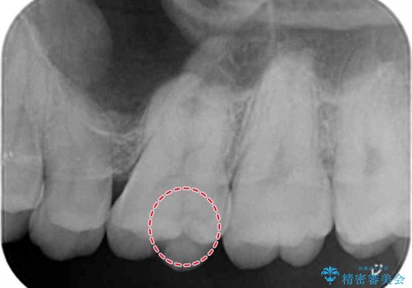 視診だけではわかりづらいですが、レントゲン画像にて昔の詰め物の下に虫歯があることがわかります。