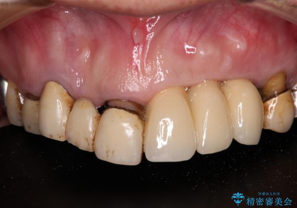 治療により前歯は非常に安定しましたが、インプラント部の両隣、特に反対側の前歯はクラウンのやり直しが必要な状態であったので、今後反対側の治療も実施していく予定です。